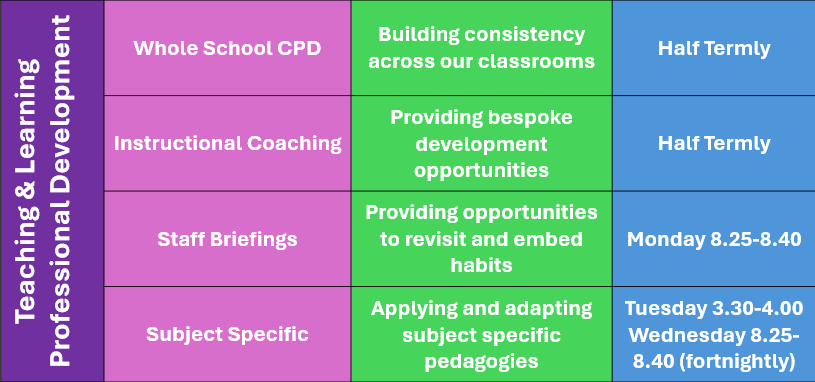 Just as we expect students to revisit content to secure long-term learning, staff CPD is structured to return to key themes over time. We revisit core strategies — such as modelling, checking for understanding, purposeful circulation and questioning — to ensure they embed deeply and consistently.